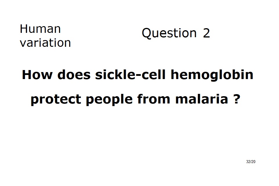 | Why? | Susceptible to malaria | Resistant to malaria | Sickle-cell anemia (usually fatal) |