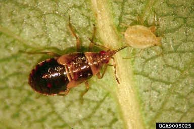| True bugs (order Hemiptera) Notice the piercing mouthparts and the wings whose transparent rear tips overlap when the wings are folded back |