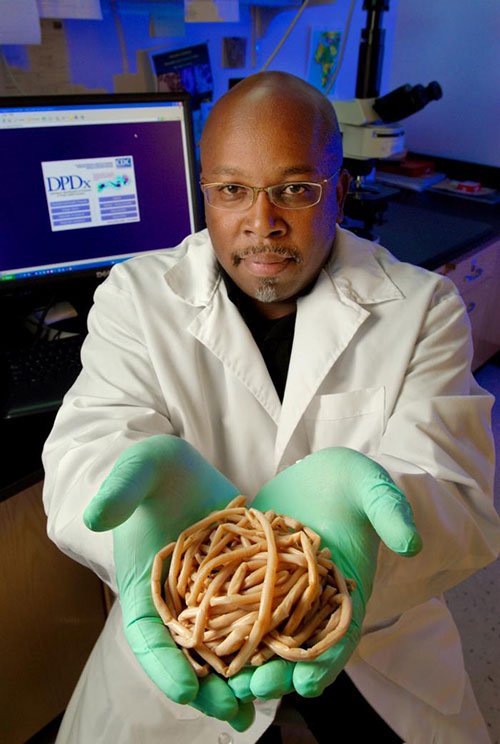| CDC worker holding a mass of Ascaris worms retrieved from the intestines of a single child in Kenya |