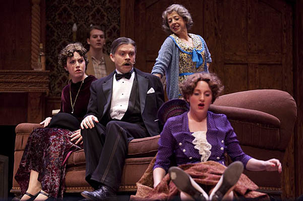 ![]() Mr. Kirby in You Can't Take It With You (2010). with (from left) Corina Parisi '13 as Mrs. Kirby, George MacDonald '10 as Ed, Kathryn Moraros '10 as Penelope Sycamore, and Bridget Brewer '11 as Gay Wellington. |