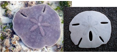 | Sand dollars are also echinoids— they are basically flattened sea urchins with reduced spines. Instead of hovering along the surface of the sea floor as most sea urchins do, they maneuver their bodies into the top 1-2 cm of sediment. |